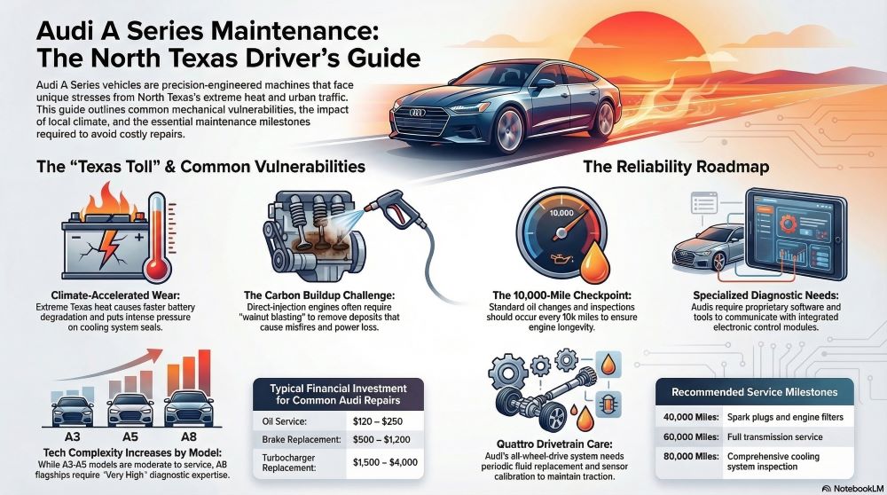 North Texas climate conditions influence how Audi vehicles age and wear. Extended periods of extreme heat affect multiple mechanical systems.