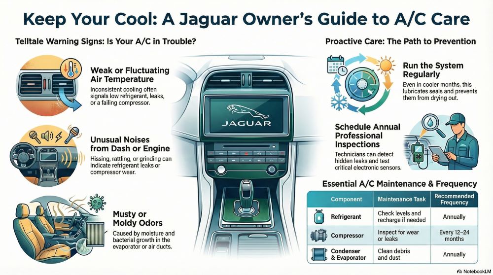 Recognizing early symptoms of A/C problems is crucial for Jaguar owners. Addressing these issues promptly helps avoid costly repairs, preserves cabin comfort, and ensures your luxury vehicle continues to perform as designed.